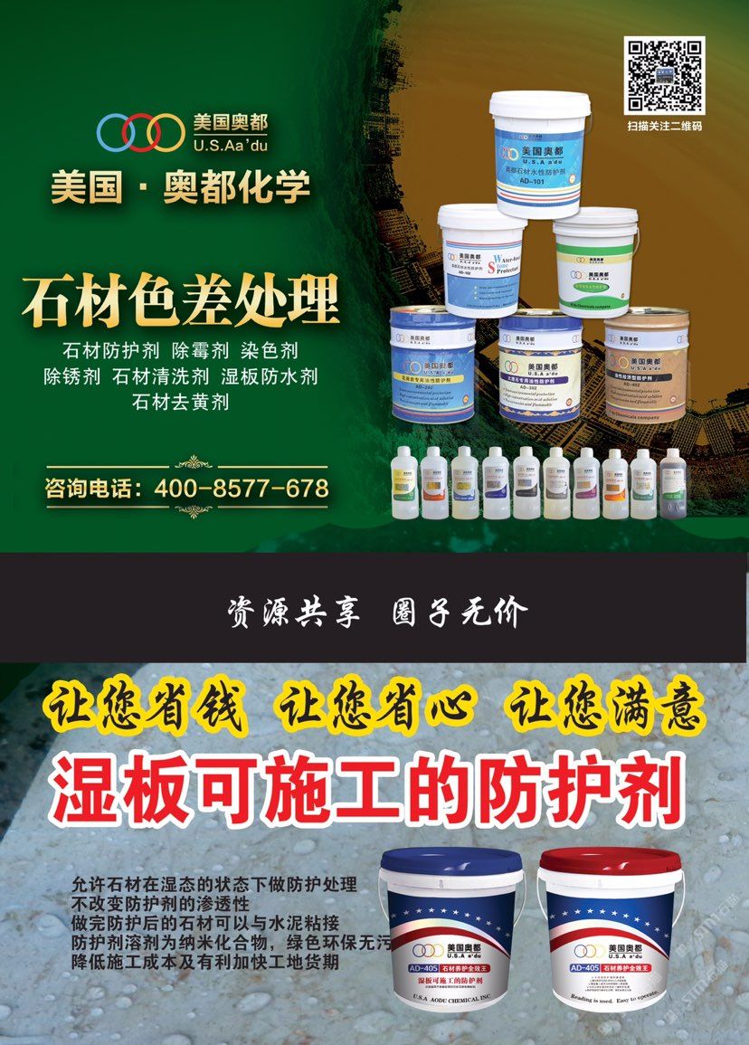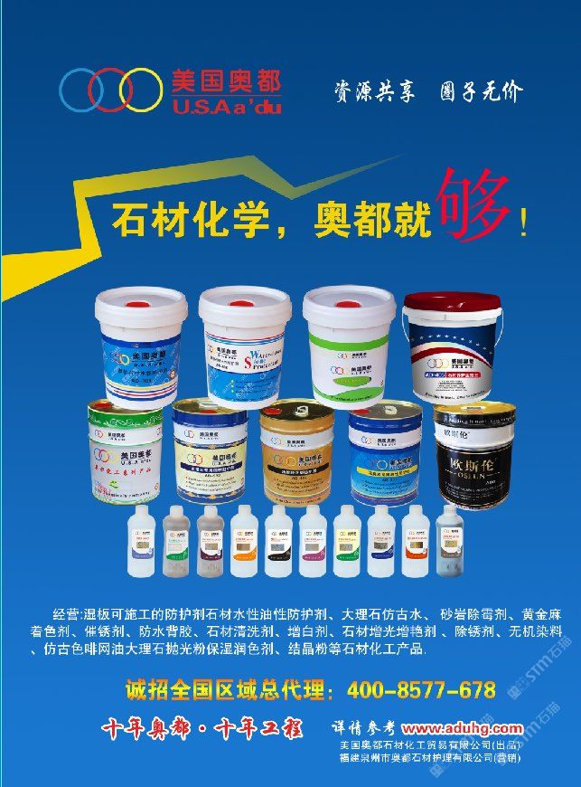 發(fā)布信息: 美國(guó)·奧都化學(xué)主營(yíng):濕板可施工的防護(hù)劑,大理石防水背膠,大理石仿古水,木瑪麗染色,木瑪麗氧化,黃金麻染色,黃金麻催銹,仿古粉,拋光粉,石材水性防護(hù)劑,油性防護(hù)劑,染色劑,增光劑,增艷劑,保濕潤(rùn)色劑,晶硬劑,石材色差處理,色線處理,催銹劑,石材返堿處理,吐黃吐銹,石材發(fā)霉處理,洗黑掃,外墻清洗防護(hù),鏡面處理,背栓鉆孔等,業(yè)務(wù)電話:13105074303林先生,